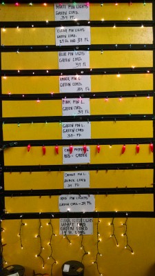 . Pin lights: clear, multi, red, green, amber, blue, green cord or white cord. Halloween lights: Purple or orange with black cord. Icicle lights: white or green cord. Net lights: clear or multi, green cord.