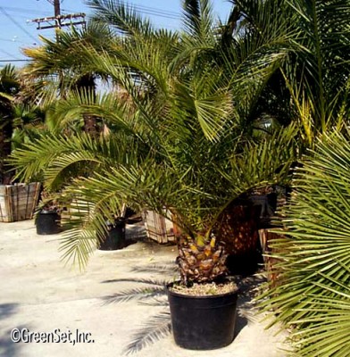 Date Palm 20gal Date Palm (Phoenix dactylifera) can grow as tall as 100 feet and stay in production for over 60 years. The fronds of the date palm are featherlike and 10 to 20 feet long. Dates grow in clusters below the fronds,a single cluster can hold 600 to 1,700 dates.